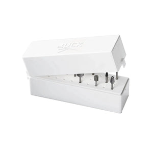 Rotary instruments (cutters, grinders) must also be protected. Important for storage after reprocessing. This robust plastic box with hinged lid and plug-in base for up to 30 cutters and grinders is ideal. This way you protect your instruments during transport for outpatient use and prove your hygiene competence.