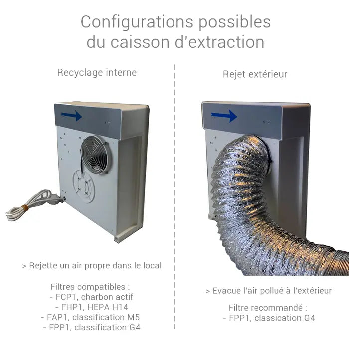 - in external discharge (filter for external discharge + evacuation duct Ø 125 mm)
